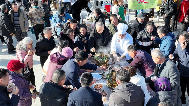 “来,免费吃火锅,尝一下我们村地道的羊肉锅。”北闸村村民刘素霞下了舞台便站在北闸村的火锅前招呼着游客,她参演了开场秧歌和一支群舞《庆丰收》。刘素霞说:“今年我家种的麦子收成不错,我特别开心。冬天闲了就和村里文艺队的姐妹们一起排练节目、参加演出。”