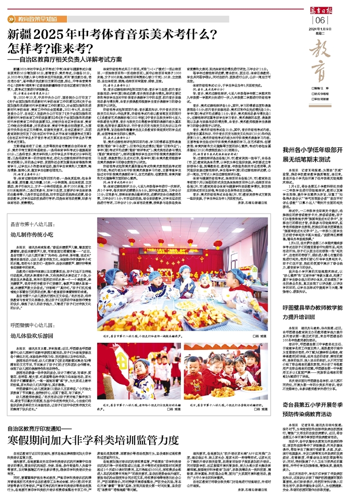 新疆2025年初中学业水平考试(中考)体育与健康考试分值由原来的50分增加到60分,新增音乐、美术考试,分值各20分,从2022年9月新入学七年级学生开始实施,采用“新生新办法,老生老办法”,逐年稳步完成新旧方案的过渡。那么,中考体音美考什么?怎样考?谁来考?记者连线新疆维吾尔自治区教育厅相关负责人,就考试方案进行详细解读。