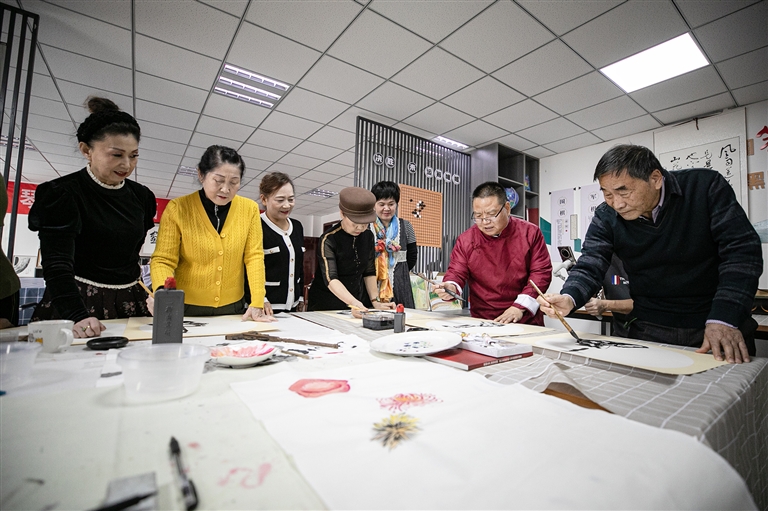 近日,昌吉市北京南路街道油运基地社区组织居民开展丰富多彩的文体活动,居民在社区活动室里写书法、剪窗花、弹古筝。图为居民正在作画。