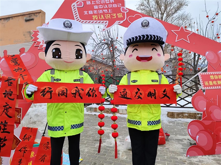 2023年12月30日,第六届“北庭年货节”开幕,吉木萨尔县公安局交警大队民警穿戴玩偶服来到现场,给过往群众赠送精美礼品和安全知识手册,讲解“一盔一带”知识的重要性、酒驾醉驾危害等交通安全法律知识。