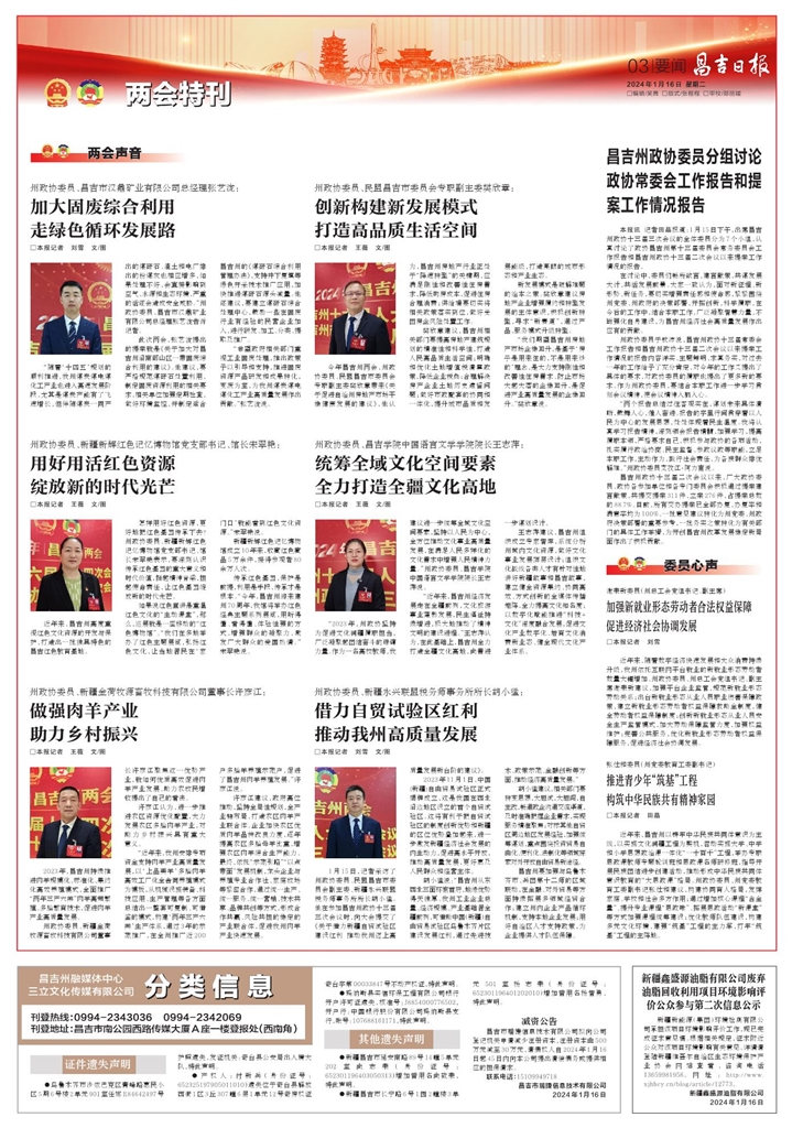 “2023年,州政协坚持为促进文化润疆履职担当,广泛凝聚起团结奋斗的磅礴力量。作为一名高校教师,我建议进一步统筹全域文化空间要素,坚持以人民为中心,全方位推动文化事业高质量发展,在满足人民多样化的文化需求中增强人民精神力量。”州政协委员、昌吉学院中国语言文学学院院长王志萍说。