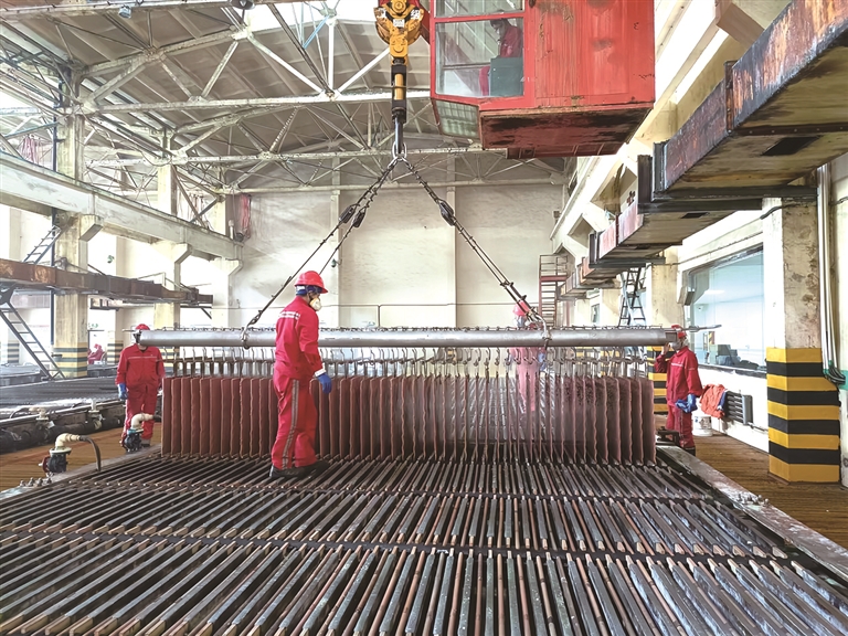 新春伊始,新疆新鑫矿业股份有限公司阜康冶炼厂抢时间、忙生产、抓建设,开足马力争创新年“开门红”。2月23日,在新疆新鑫矿业股份有限公司阜康冶炼厂的阴极铜生产车间,工人们正在生产线上忙碌着,一摞摞阴极铜板经过称重、分拣、配板、打包、贴标等多道工序后,销往北京、上海等地。□贾金艳摄