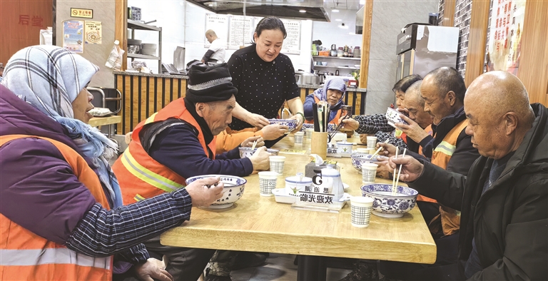 环卫工人马银凤的工作区域就在面馆附近,她是面馆的常客。冬天取暖、夏季乘凉,同时还吃上了半价牛肉面,她说:“这碗牛肉面是爱心面,肚子吃饱了,心里也暖和了。”