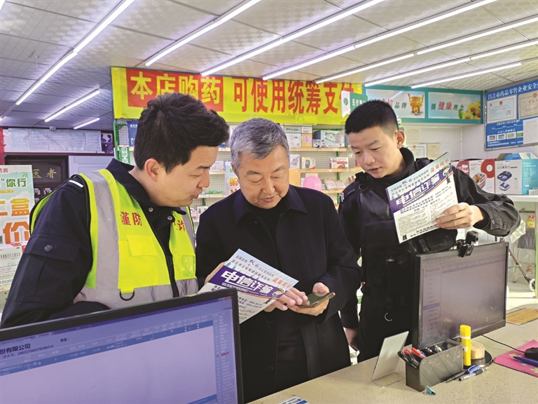 3月1日,昌吉市公安局建国路派出所民警深入辖区商户开展防范电信诈骗宣传。 民警通过发放宣传资料、面对面宣传等方式,结合真实案例就诈骗手段、诈骗后果、如何防骗等知识进行了详细讲解,提醒群众在日常生活中要注意保护各类信息,不要将个人信息、短信验证码、支付密码等内容告知他人,不轻易进行转账汇款、点击链接等操作,收到熟人的救助信息要及时向本人联系核实。 □本报记者 廖冬云摄