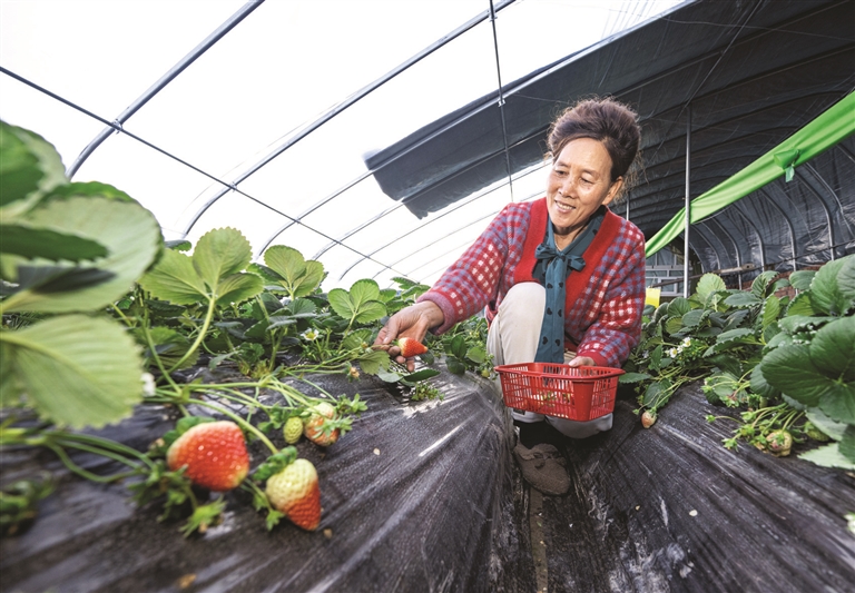 3月10日,木垒县东城镇四道沟村村民雷静在自家庭院中的大棚里采摘草莓。雷静今年在自家庭院内建设一座200平方米温室大棚,种植奶油草莓2000多株。眼下草莓已陆续成熟,吸引众多县城市民前来采摘。