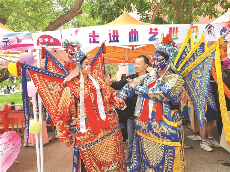 在“走进戏曲世界”展示区,来自新疆生产建设兵团豫剧团的老师正在为学生进行妆造和动作技术指导。今年20岁的阿英格是新疆农业职业技术学院工程分院学生,从高中起就喜欢戏曲,今年3月底加入了该校中华传统曲艺社团。“豫剧是中国五大戏曲剧种之一,我在豫剧现代戏《朝阳沟》中饰演了栓宝的角色。能在大学圆了戏曲梦,我非常开心。感谢学校给我们搭建了学习交流展示的平台,我也将为弘扬传承中华优秀传统文化贡献力量。”阿英格说。
