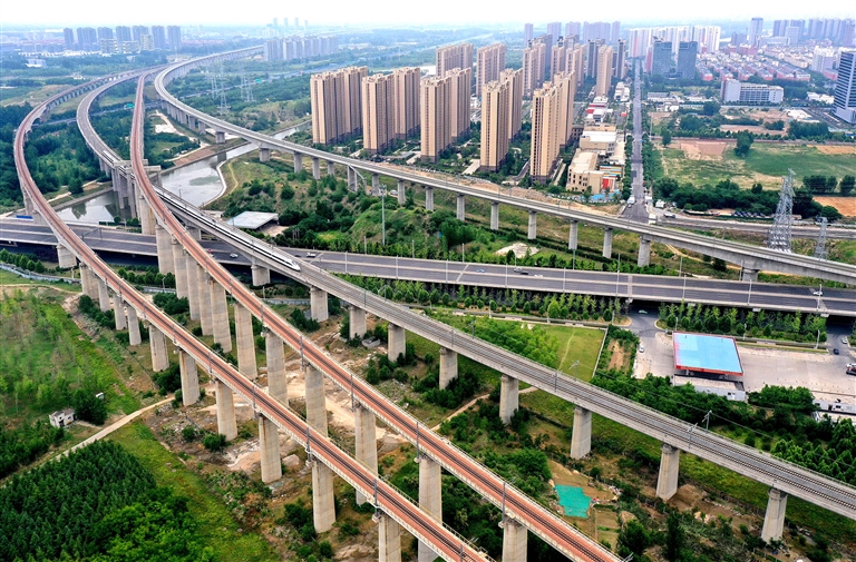 一列动车组列车行驶在郑州东站附近的线路上(5月30日摄)。