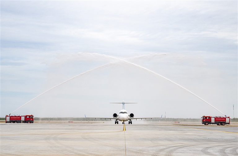 本报讯 记者刘辉报道:8月8日10时53分,华夏航空一架喷气式飞机,从喀什徕宁国际机场飞抵奇台江布拉克机场平稳降落,标志着奇台江布拉克机场正式通航。奇台江布拉克机场以“过水门”仪式迎接了首个航班,并在航站楼前举行了通航仪式。