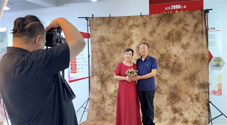 8月7日下午,昌吉市中山路街道御景社区举行了“爱在七夕,情系你我”我们的节日系列活动,邀请顺之美定格摄影馆的摄影师,为金婚、银婚老人拍摄爱的合影。图为摄影师为老人拍照。