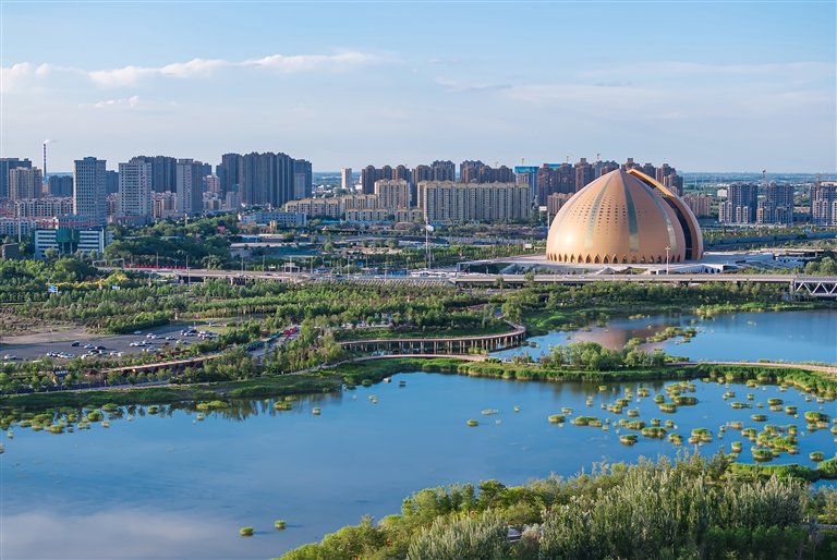 从高空俯瞰庭州生态绿谷,五大主题公园由南至北坐落于头屯河西岸,金色的新疆大剧院如雪莲花般绽开于碧水之滨。