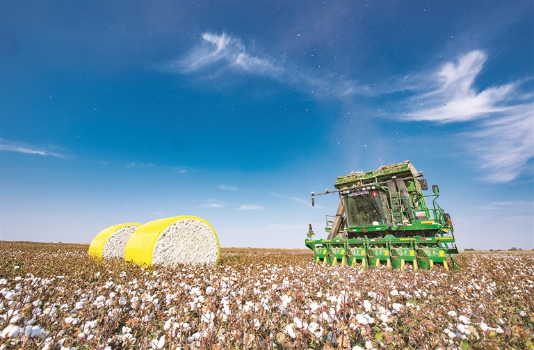 玛纳斯县北五岔镇棉田,自走式打包采棉机在作业。