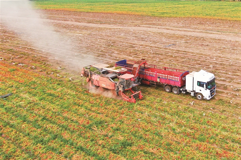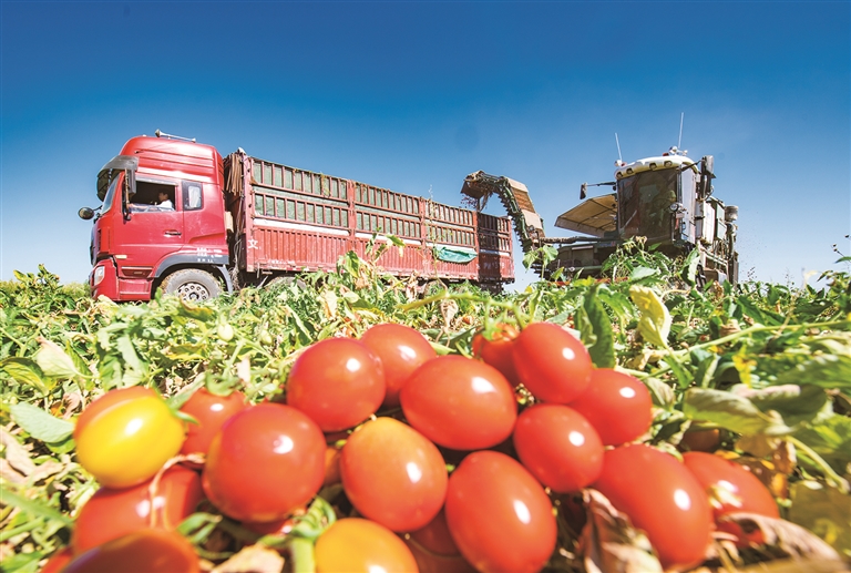 呼图壁县二十里店镇良种场村,番茄收获机正在采收成熟的番茄。
