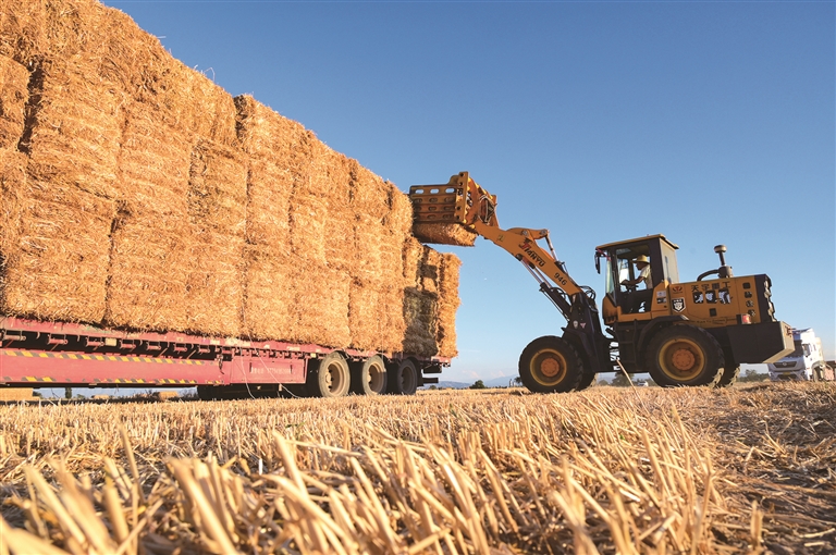 呼图壁县二十里店镇宁州户村麦田中,农民利用叉车将打捆后的小麦秸秆装车回收。□本报记者 陶维明摄