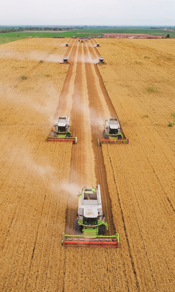 昌吉国家农业高新技术产业示范区联强农场,小麦联合收割机在收割小麦。□本报记者 何 龙摄