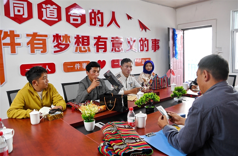 仓秋多吉(左二)和团队核心成员商讨产品销售提升策略(8月24日摄)。
