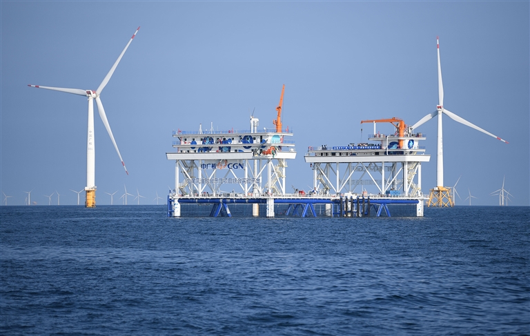 这是9月2日拍摄的中广核“伏羲一号”风渔融合网箱平台。