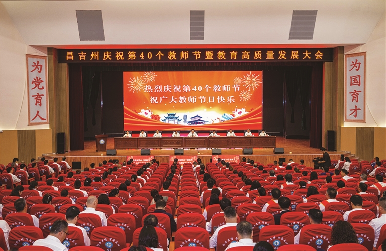 本报讯 记者孙学良报道:硕果盈枝,桃李芬芳。近日,昌吉州庆祝第40个教师节暨教育高质量发展大会在昌吉州第一中学西校区召开,深入学习贯彻党的二十大和党的二十届三中全会精神,更加突出教育优先发展战略,大力弘扬教育家精神,推进教育现代化,加快建设教育强州,奋力开创昌吉州教育高质量发展新局面。