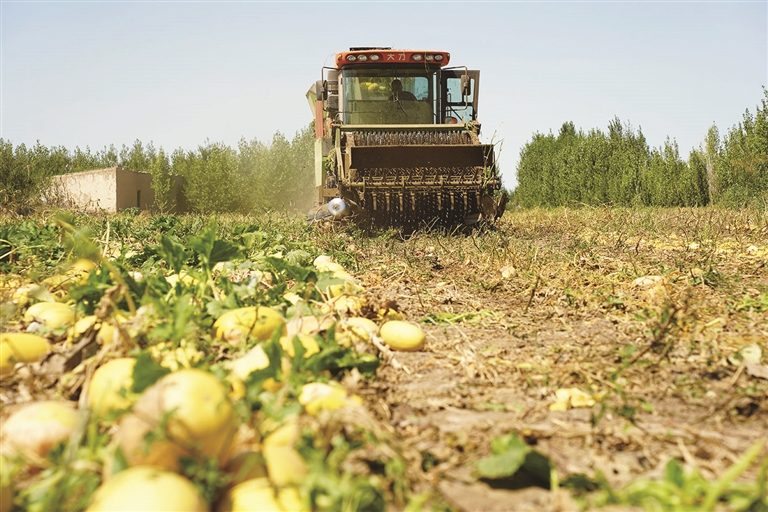 8月26日,在吉木萨尔县三台镇羊圈台子村种植户卢雪峰的籽用葫芦田里,葫芦采收机正在采收作业。三台镇1.5万亩籽用葫芦相继成熟,连日来,种植户正抢抓晴好天气抢收。□吴欣昊摄