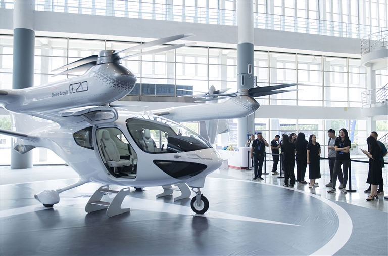 9月6日,观众在2024低空经济发展大会创新成果展区了解一款电动垂直起降飞行器。