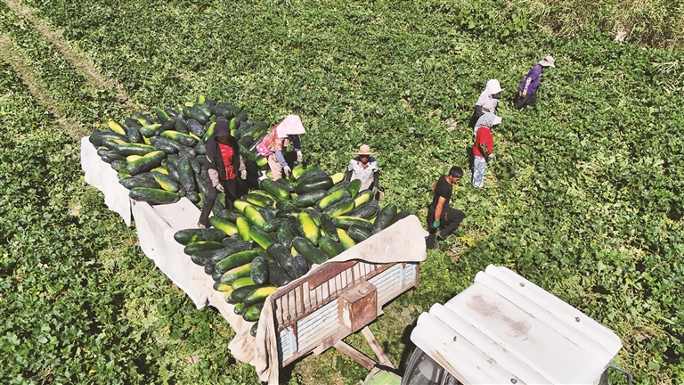 近日,在呼图壁县园户村镇十三户村冬瓜种植基地,农民在田间忙着采收、搬运、装车,一派丰收景象。近年来,呼图壁县立足区位交通及资源禀赋优势,合理规划发展冬瓜种植,不断引进优良品种,持续完善产销对接,当地冬瓜种植产业链已逐渐形成,有效带动村民致富,助力乡村振兴。 □本报记者 陶维明摄