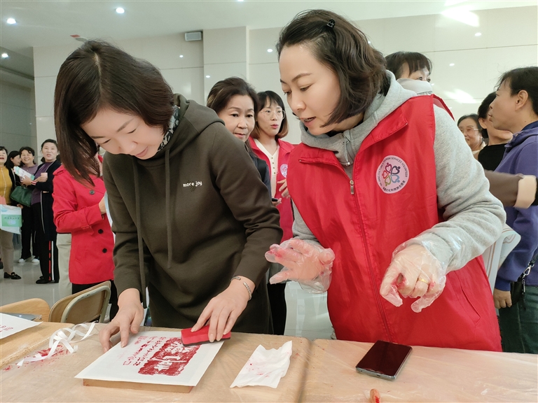在拓印活动区域,老人在工作人员的指导下,小心翼翼地将宣纸覆盖在刻有精美图案的拓版上,不一会儿,一幅幅栩栩如生的拓印作品就诞生了。大家互相欣赏着彼此的作品,交流着拓印的技巧,气氛十分融洽。