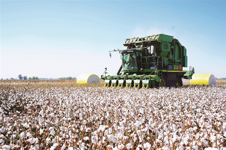 采棉机驾驶员赵全峰说:“采棉机采收棉花效率特别高,一天能采收500亩地,今年的机采费是一亩200元左右。”