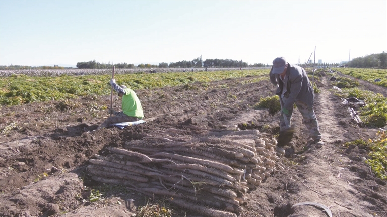 玛纳斯县兰州湾镇王家庄村村民刘宪柱种植山药多年,今年种了70亩山药,这两天正忙着采挖,新鲜的山药吸引了不少顾客前来购买。石河子市民张君说:“我们每年都来这里买山药,这里的山药品质杠杠的,我们买了好几十公斤。”