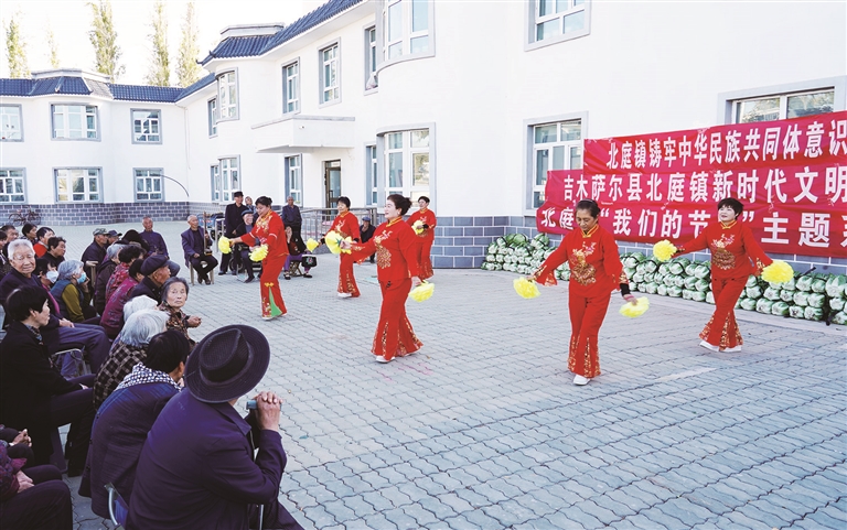10月11日,吉木萨尔县北庭镇幸福互助院工作人员、东二畦村文艺团队为老人表演舞蹈。北庭镇联合北庭学研究院开展了以“弘扬重阳美德,传递敬老温情”为主题的重阳节活动,营造了敬老、爱老、助老的浓厚氛围。□马文婷摄