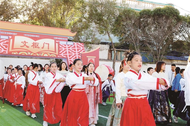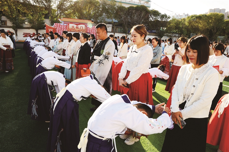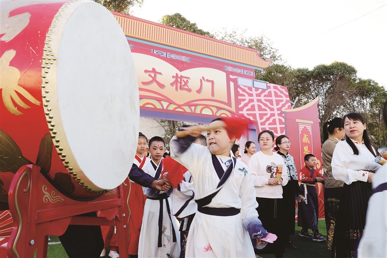 曲轻扬,礼初起。随着欢快的音乐响起,身着汉服的家长和孩子们昂首阔步,出旗、击鼓、过文枢门,习汉礼、正衣冠、给父母行鞠躬礼,让孩子们在浓浓的文化氛围中感知十岁知礼,谦恭礼让、温文尔雅。十岁知文,听说读写唱、四诗风雅颂;十岁知恩,敬重天地父母与师长,感悟生命蓬勃。学生家长崔璇说:“今天很高兴能参加孩子的成长礼,家长和孩子都穿着汉服举行仪式,弘扬中华优秀传统文化,让孩子在这种氛围中长大,很有意义。”十岁成长礼是中国传统“八礼四仪”中的一场重要仪式,它标志着孩子成长的第一个十年结束,是孩子成长的一个重要阶段。孩子们在这个阶段已经褪去天真,即将开启人生下一个十年的新篇章。