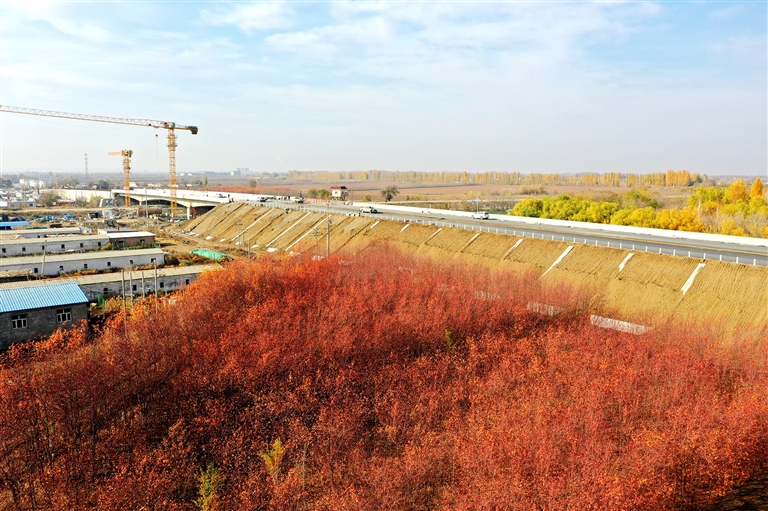 截至目前,项目的各项工程都在稳步推进。路基填筑累计完成61万m^3,完成总量的93%;路面水稳基层累计完成5公里,完成总量的46%;沥青面层已完成1.5公里,完成总量的14%;K1+700,500干渠大桥下部结构完成100%,上部结构完成94%。施工单位正紧紧抓住最后的黄金施工期,争分夺秒地加快施工进度,力求按时、高质量地完成项目建设。预计在11月30日,这条崭新的公路将正式通车。图为11月1日航拍的S231线五家渠至昌吉公路改扩建项目现场。□梁宏涛摄