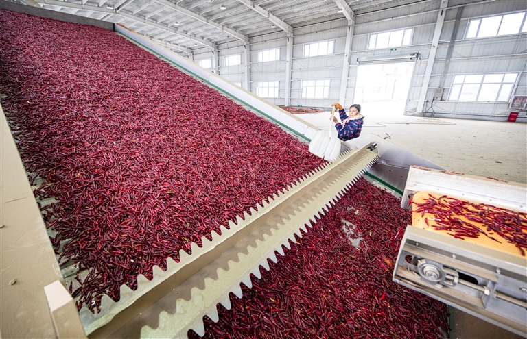 昌吉市佃坝镇西沟村大力发展特色辣椒产业,形成育苗、种植、采收、烘干、销售一体化的区域经济发展模式,村办合作社预留集体机动地种植辣椒1100亩,由中央衔接资金和村集体出资2000余万元建成辣椒烘干厂,每天可烘干鲜辣椒140吨左右,提供就业岗位72个,助力农民增收。 □本报记者 何 龙摄