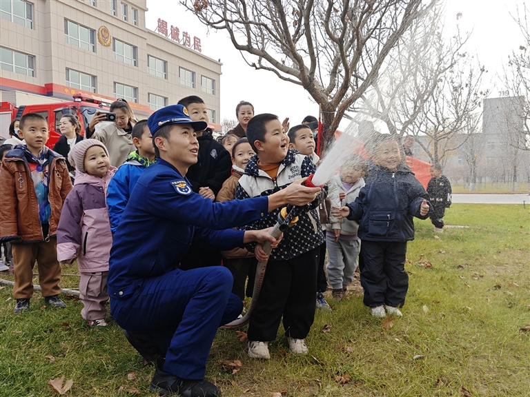消防员向小朋友介绍了各种消防车辆和随车器材装备,小朋友在消防员的帮助下使用水枪体验灭火。□翟丽丹摄