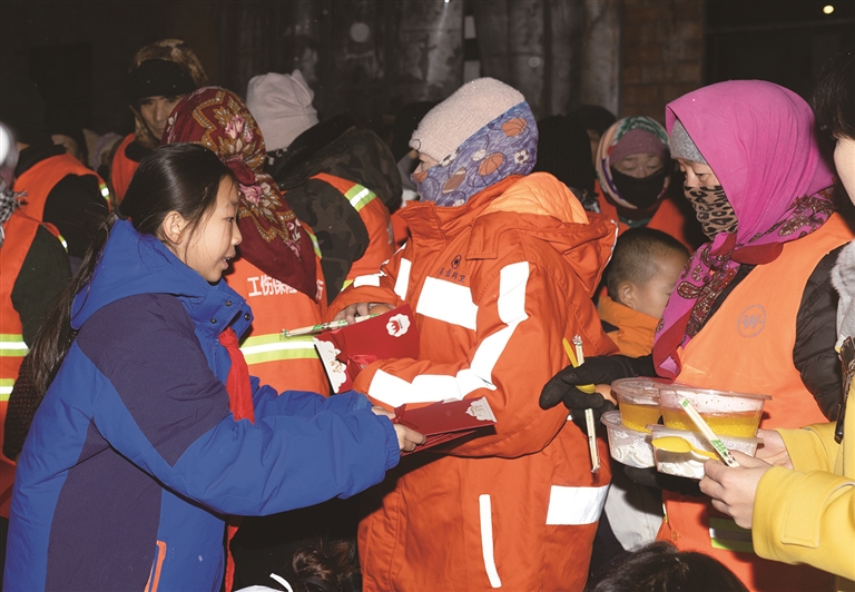 为了让每个环卫工人都能吃上新鲜、可口、热乎的饺子,11月27日下午,志愿者就将自己带来的羊肉、牛肉、芹菜、大葱、面等食材摆上桌,提前准备并分工协作包饺子。11月28日7时许,天还没亮,志愿者早早集合,有的将包好的饺子下锅煮熟,有的忙着将饺子、粥和鸡蛋装盒打包。很快,一份份爱心早餐就送到了昌吉市市容环境卫生管理中心中山路环卫所130位环卫工人的手中。“没想到一大早就能吃上热乎乎的饺子,我们心里感觉暖暖的!”环卫工人李月娥高兴地说。