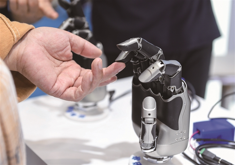 2024年11月15日,在深圳举行的第二十六届中国国际高新技术成果交易会上,观众体验深圳睿研智能控制有限公司展示的一款灵巧手。