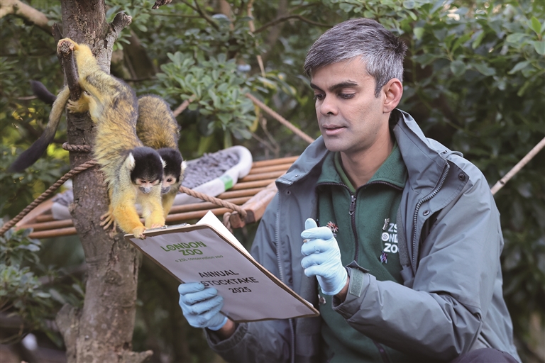 1月3日,在英国伦敦动物园,一名工作人员对松鼠猴进行盘点。