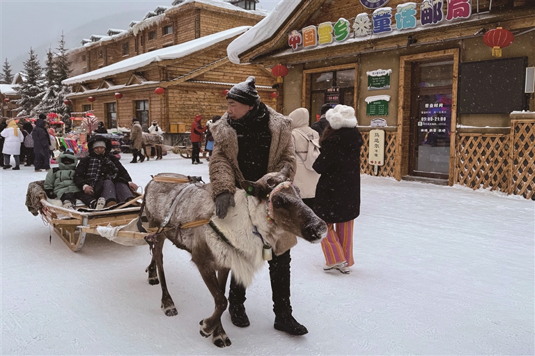 2024年12月28日,在“中国雪乡”景区,游客体验东北特色“鹿拉爬犁”。近日,位于黑龙江省海林市的“中国雪乡”景区迎来客流高峰,日均游客数量连续突破2万人。
