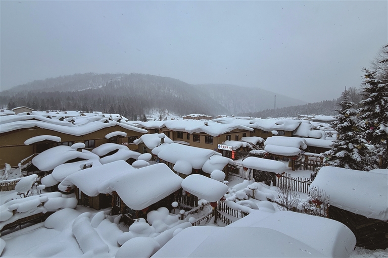 2024年12月28日,在“中国雪乡”景区,绵密积雪落在房顶。