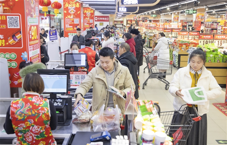 1月23日,市民在昌吉市一家商超内置办年货。春节来临,昌吉市各大商超提前备足了年货,各类商品琳琅满目。□本报记者 巨海成摄