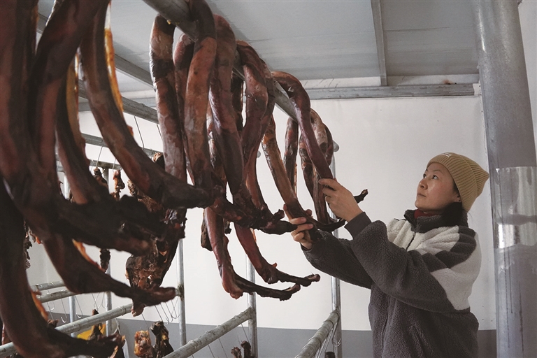 2月4日,呼图壁县五工台镇百泉村供销综合服务社加工车间,村民巴合达尔·尔斯别克正忙着为顾客挑选马肠。近几年,百泉村巧用资源优势,打造熏马肉、马肠等特色产品,拓宽了村民的增收渠道,增加了村民收入。