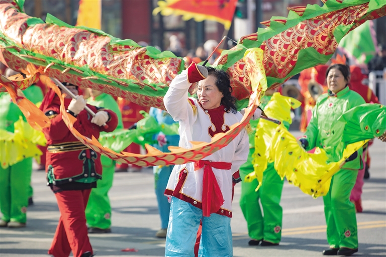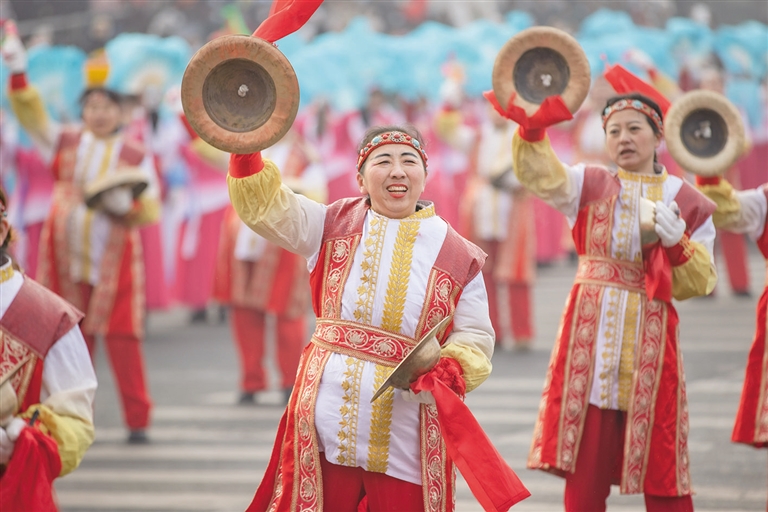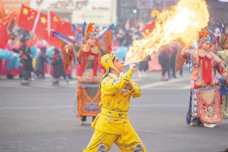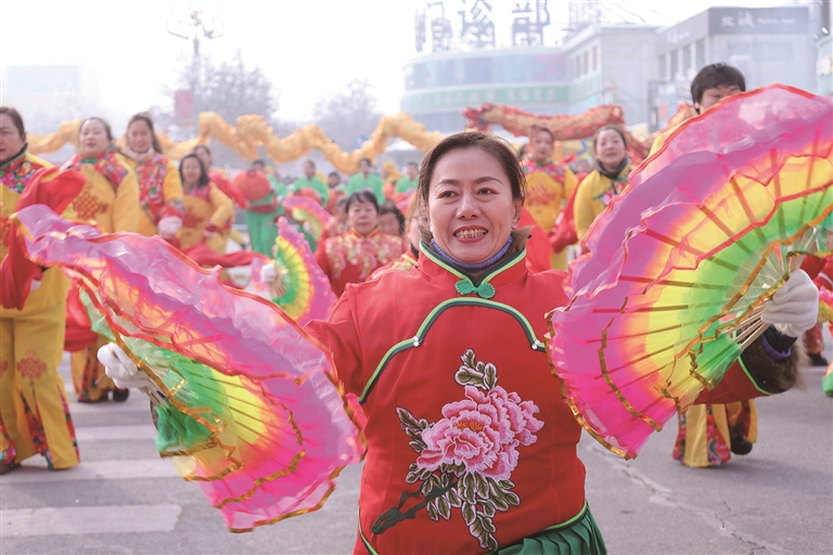 演员们一路走一路演,观众一边看一边高举手机拍下精彩瞬间。尽管天气寒冷,但丝毫没有阻挡演员的表演激情和群众的观看热情。在欢乐祥和的氛围中,歌舞声、欢呼声连成一片,绘就了一幅幸福美满的美丽画卷。