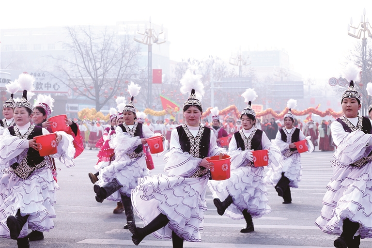当日10时,昌吉市城区锣鼓喧天,人山人海,热闹非凡。昌吉市各族群众和游客早早来到社火表演现场,抢占最佳观演位置。