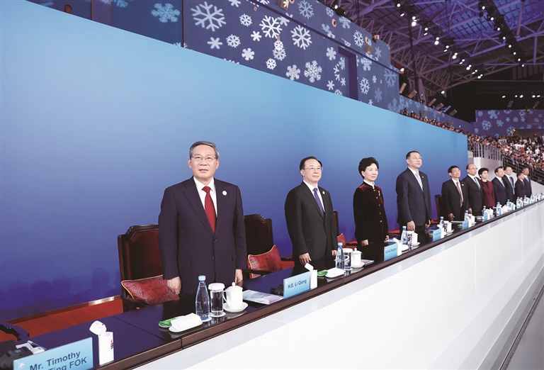 在《点亮亚洲》的乐曲声中,李强同亚奥理事会第一副主席霍震霆等步入主席台,向观众挥手致意。