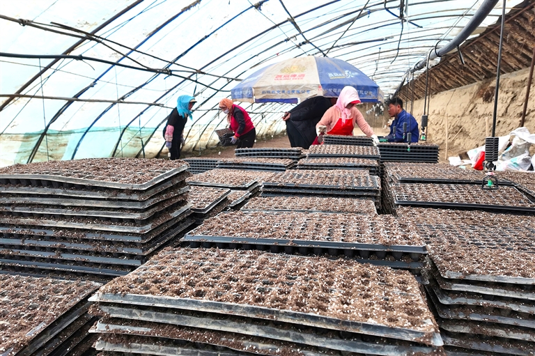 张志明从2月底开始育苗,每天育苗1000盘,一天的用工量在5至8人。该镇农业发展中心农技人员经常来到大棚跟踪服务,进行技术指导,帮助解决生产中遇到的各种问题。
