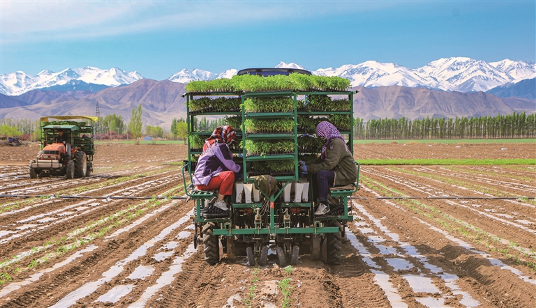 5月4日,吉木萨尔县老台乡老湖村,农户在使用番茄移栽机移栽番茄苗。