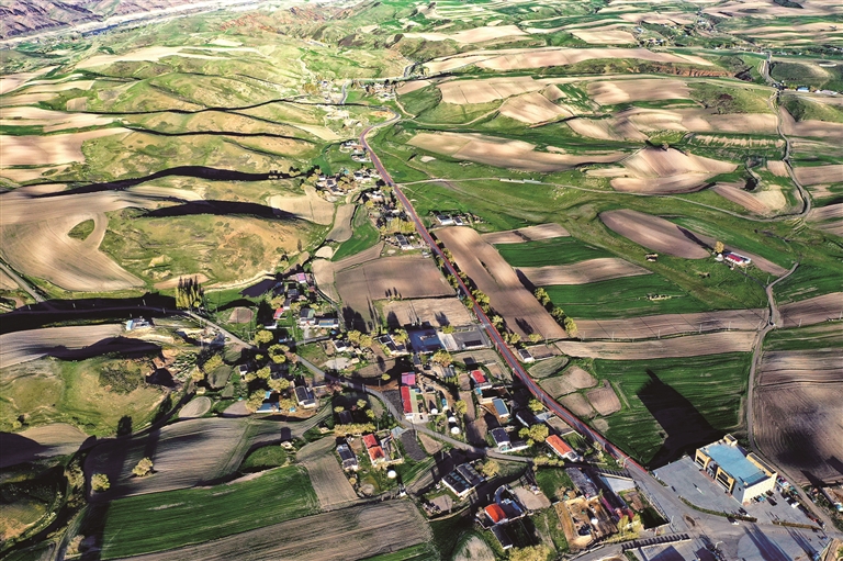 农田的线条流畅自然,与周围的山峦、沟壑和村庄形成了和谐美丽画面。