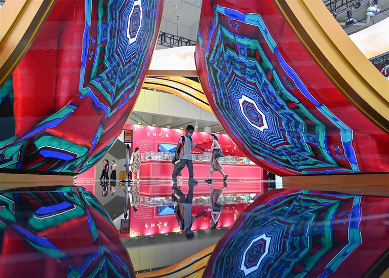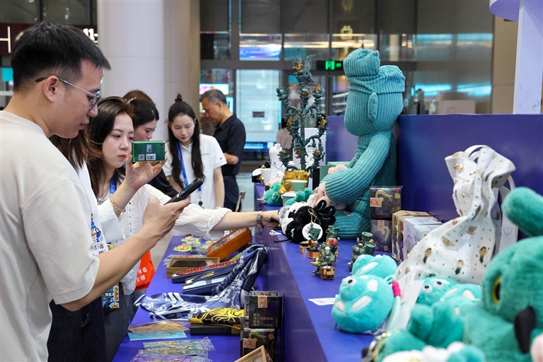 5月23日,人们在文博会“文创中国”展区选购三星堆文创产品。