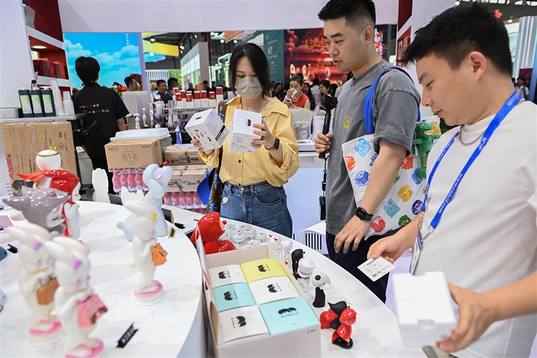 5月23日,人们在文博会“文创中国”展区选购文创产品。