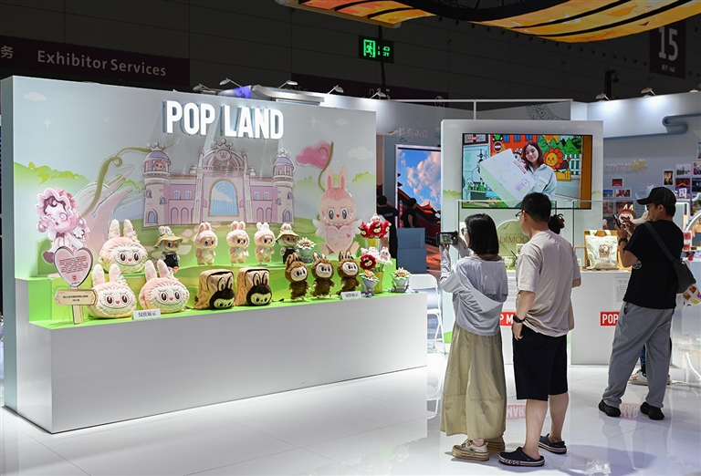 5月24日,在文博会北京展区,观众在泡泡玛特城市乐园展台前拍照。