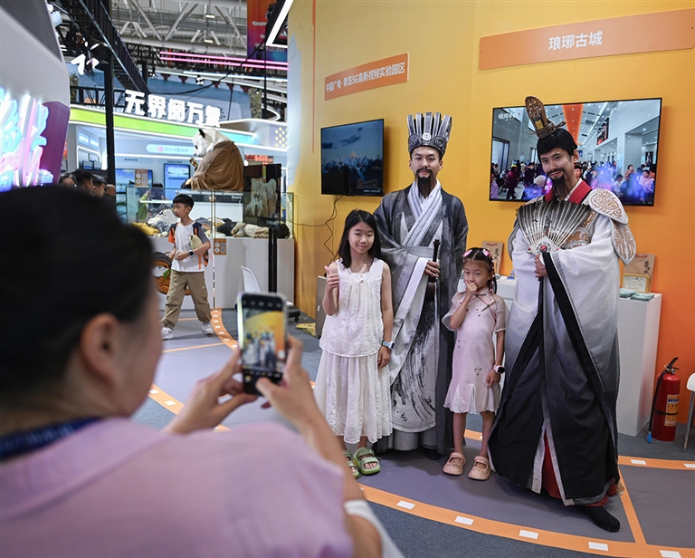 5月24日,在文博会山东展区琅琊古城展台,儿童与王羲之、诸葛亮扮演者合影。□新华社记者 肖恩楠摄