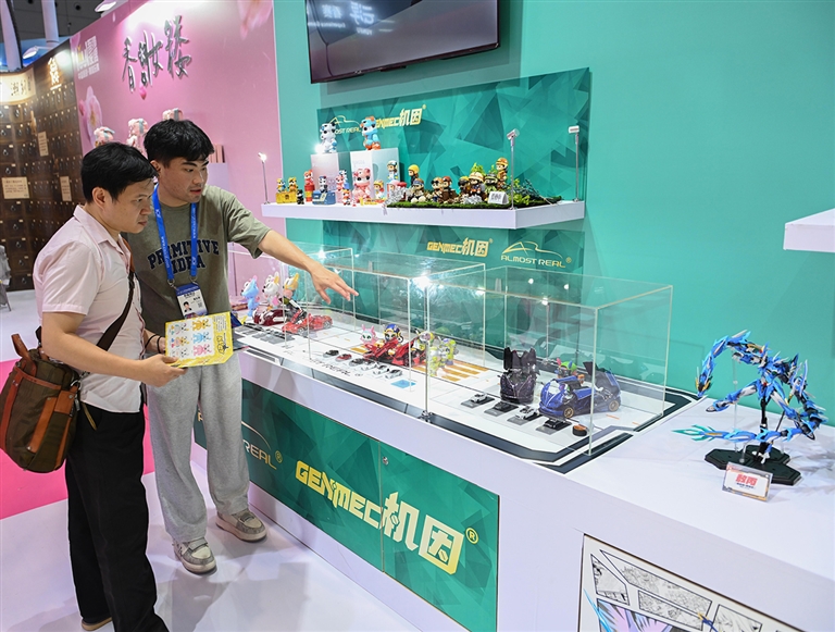 5月24日,在文博会东莞展区,工作人员为观众介绍潮玩产品。目前,东莞出产了全国超八成的潮玩,全球近三成的动漫衍生品。